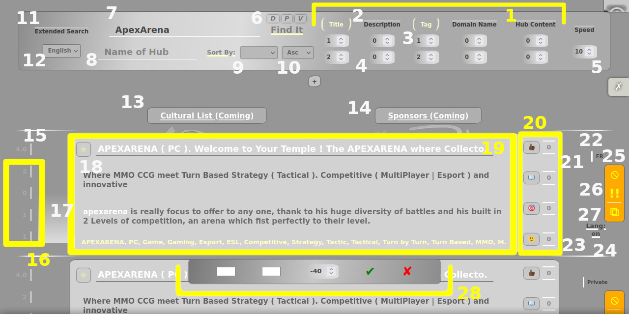 The Community Rates with also 4 Part (From top to bottom). Trust Rate (To indicate a hub which seem reliable. ie: trustpilot.com), Cultural Rate (indicating a platform with a lot of educational content ie: museums), Precision Rate (indicating a platform with give a lot of details on specific aspect. ie: europa.eu), Fun Rate (A hub where there is a lot of Jokes). You can add +/- 1 to each platform in each category helping everyone to know if it match with it's needs.
